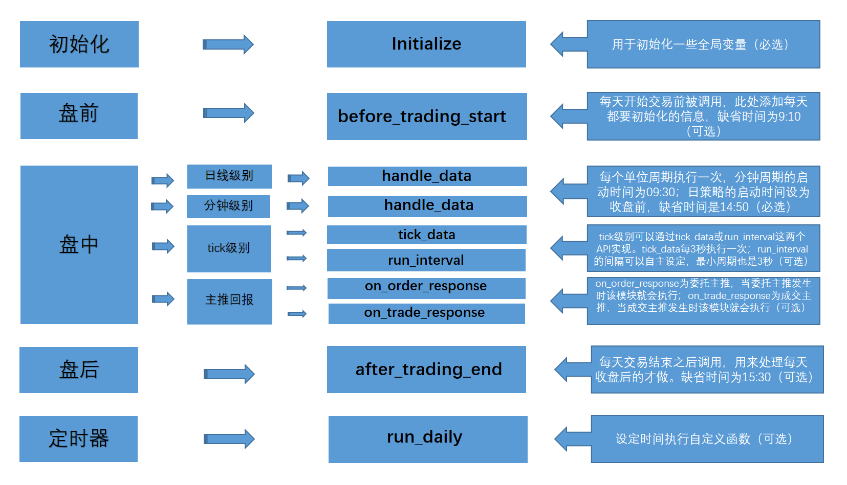9:31(回测)/9:30(交易)~15:00分钟为盘中运行时间,分钟级别回测环境和交易环境支持运行在run_daily中指定交易时间(如time='14:30')运行的函数;回测环境和交易环境支持运行handle_data函数;交易环境支持运行run_interval函数