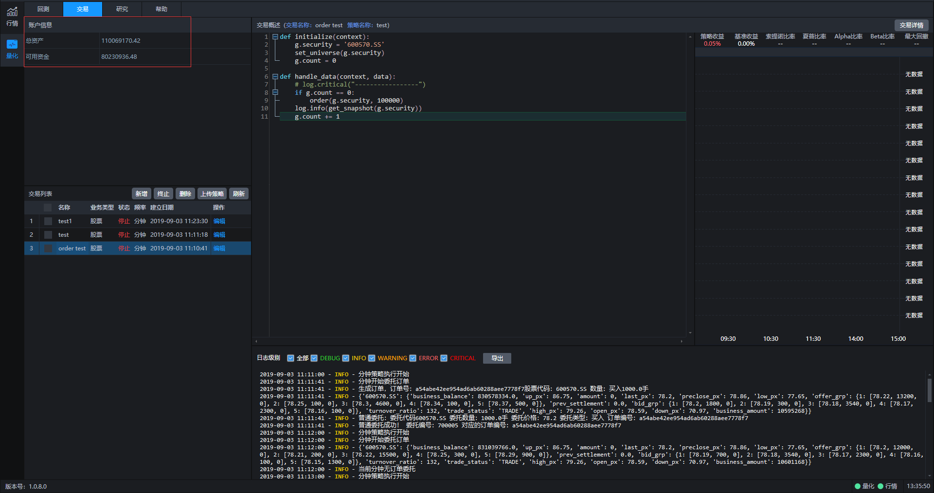 交易开始运行后,可以实时看到总资产和可用资金情况,同时可以在交易列表查询交易状态。