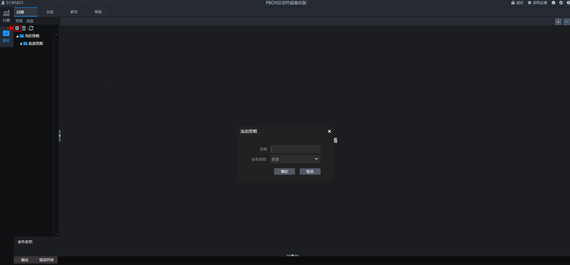 开始回测和交易前需要先新建策略,点击下图中左上角标识进行策略添加。可以选择不同的业务类型(比如股票),然后给策略设定一个名称,添加成功后可以在默认策略模板基础上进行策略编写。